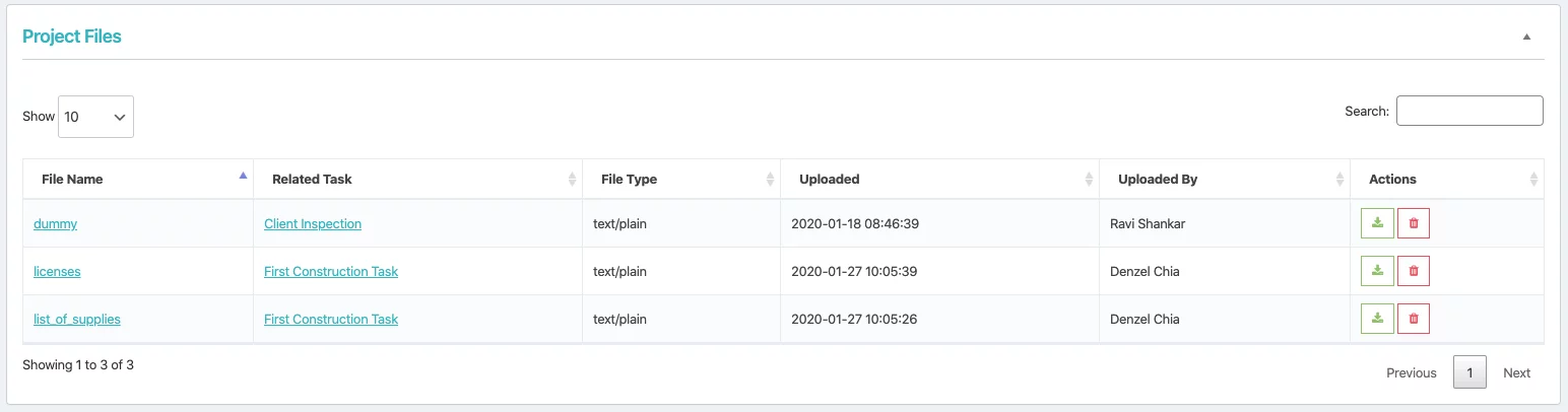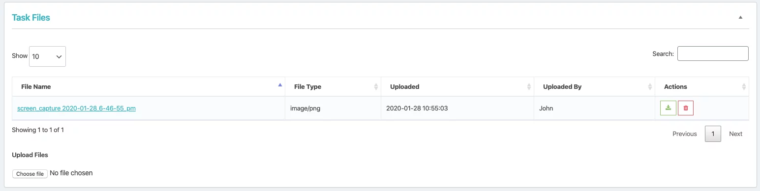 - After you have successfully uploaded a file, it will show in the task files table.