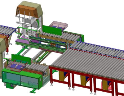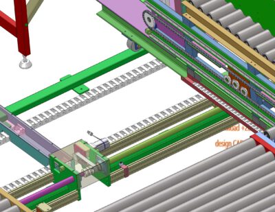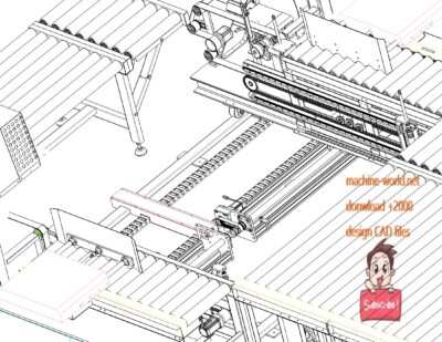 This is industrial 3D model 1 5 meter carton strapping machine, the width is adjustable and can be compatible with different sizes of cardboard within 1.5M. Roller chain drive is used. When the product enters the platform, the pusher mechanism moves to push the product to accelerate the inflow. There are flapping cylinders on the left and right sides, and blocking cylinders in front to form an entire neat stack of cardboard.