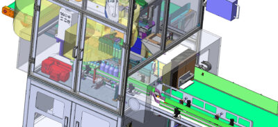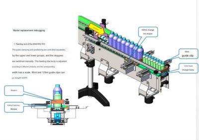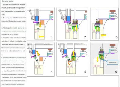 Summary of operation of industrial 3D model Opening and packing medicine bottles equipment: 1. The first row is placed into the box from the left and the first partition is inserted, and the partition module remains stationary; 2. Manipulator takes second row to pack, Remove partition module 3. After removing the partition module, the operator moves to the left to ensure that it is completely flat with the partition 4. Module partition take the second bottle and rotate it into the box below the second row of bottles 5. The operator grabs the third row on the right side of the box and places it in the box 6. The bottom of the third row of bottles forms a tangent angle to the shoulders of the second row of bottles to ensure the relative position of the baffle Move out, the operator moves down to make the baffle vertical , which also supports pressing down on the baffle and loading the bottle into the box (or the baffle module presses down on the partition twice to set it in place).