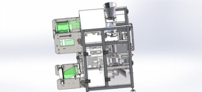 industrial 3D model of 300 standard pillow packing machine (mask packing machine) Packing machine Pillow is suitable for packing food, pharmaceutical, daily necessities, disposable products, hardware products, plastic products, toys, stationery, industrial supplies, industrial parts, automotive parts and so on, this design is specially designed for mask packing, the mask is conveyed by synchronous belt mound into the main machine, the packing film is packed from bottom to top and the packing process package is completed through middle seal, blade and other stations. The machine includes 2 servo motors and frequency converter motor As the power supply, this is a common configuration in the industry,